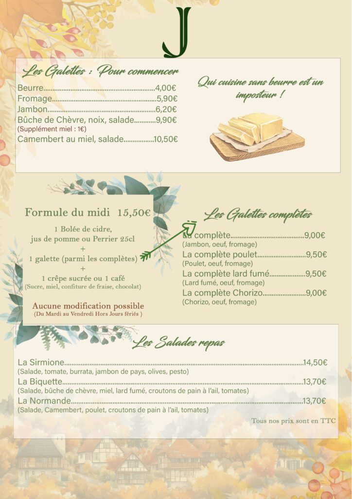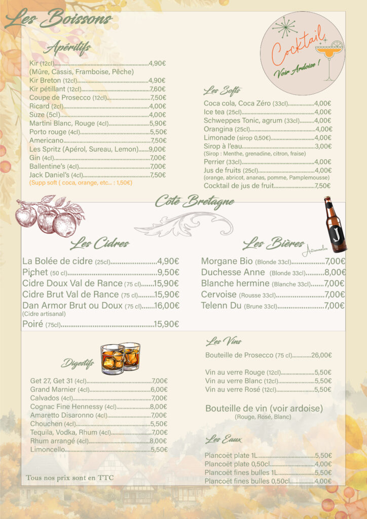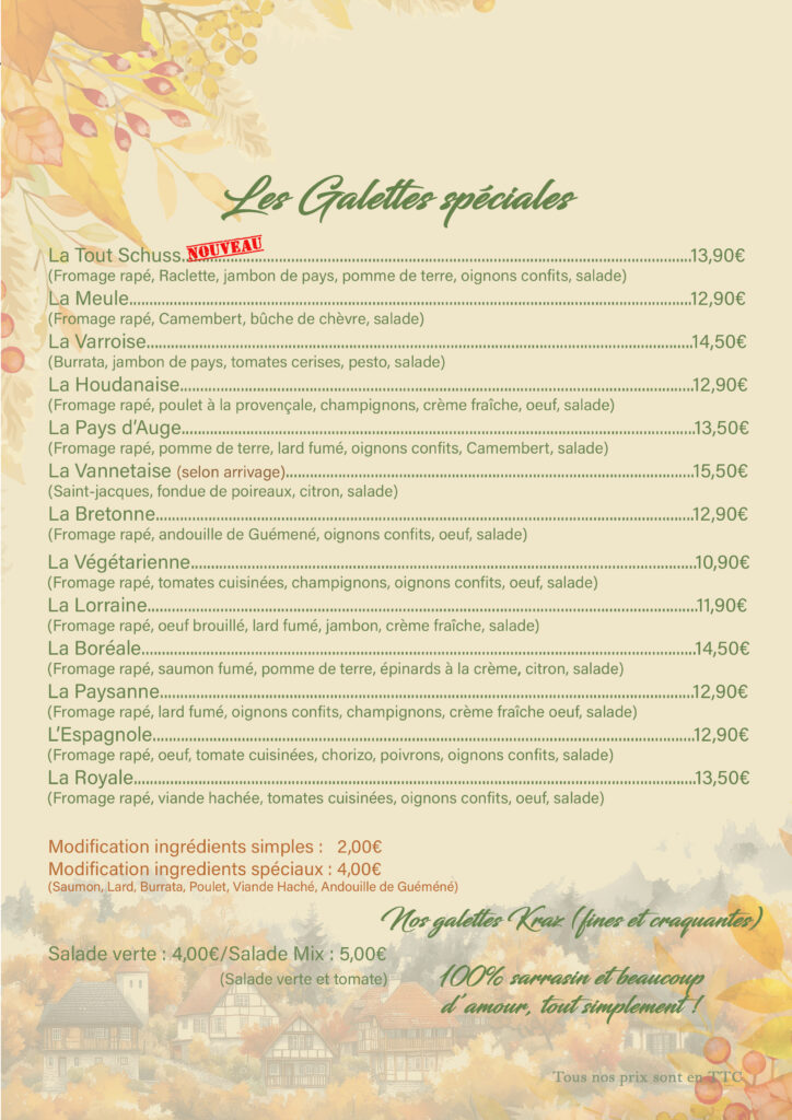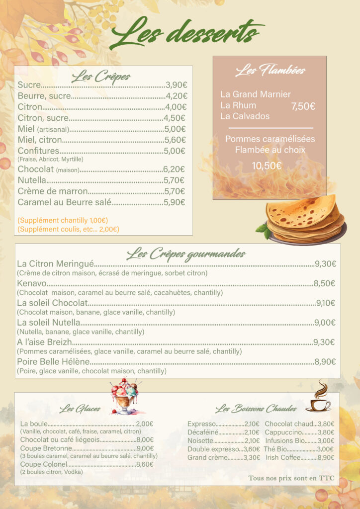 La carte de votre crêperie évolue avec les saisons, vous retrouverez nos galettes & nos crêpes signatures tout au long de l’année mais quelques petites nouvelles font leur apparition à la carte selon la période de l’année 🙂
